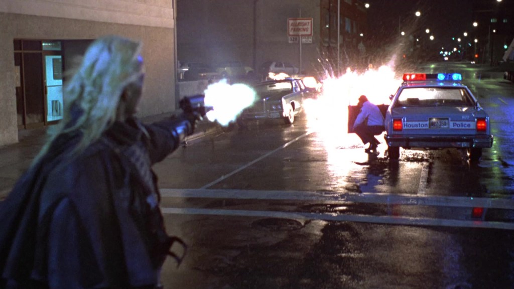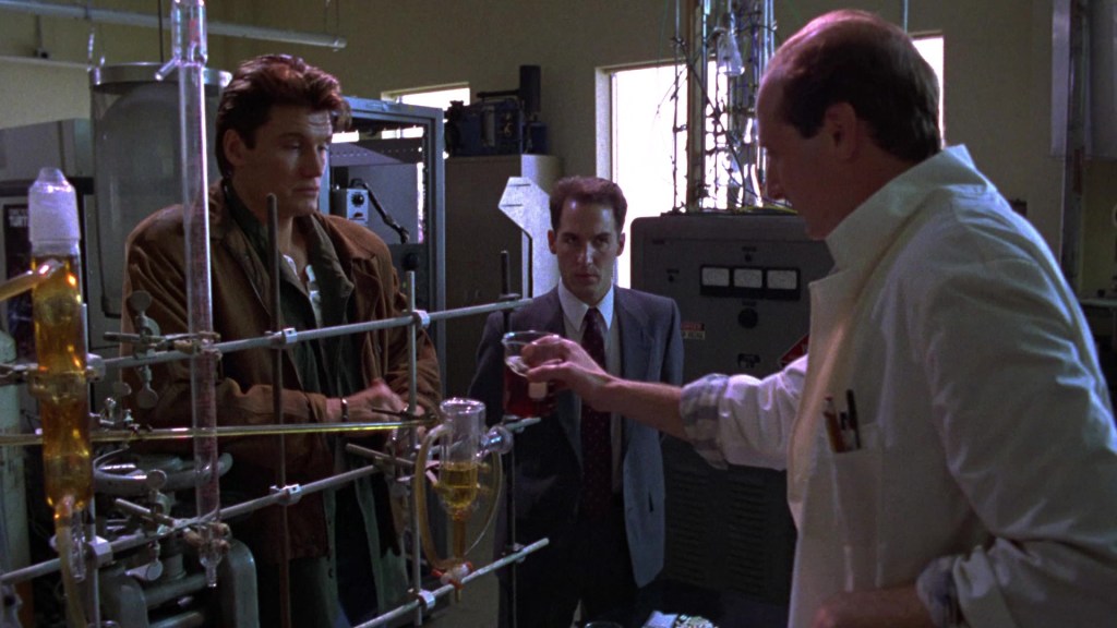 With a theory linking back to the initial theft of the drugs, the FBI assigns Caine a new partner in Smith (Benben) and tasks them with finding out who – or in this case, what – is entering the picture. Baxley splits the film into two major subplots, one involving the cops’ investigations of the dealers and the stealers, which sometimes includes their personal matters like Diane’s (Brantley) connection to the case and to Caine, and the other to Talec, who’s dealing with another flatfoot in the form of Azeck (Bilas). These threads run parallel for some time, possibly too long, but are woven into each other well by the third act, which reveals the use Talec has for the drugs and ensues with a bust.