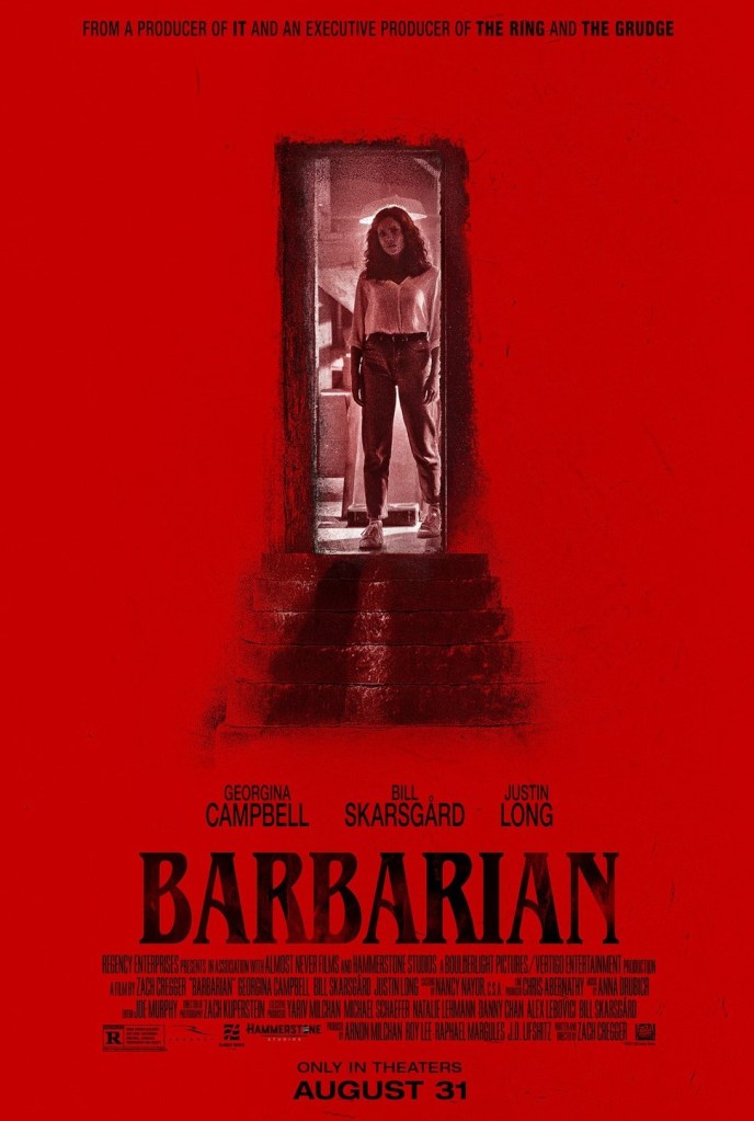 Barbarian was directed and written by Zach Cregger and stars Georgina Campbell, Bill Skarsgard, Justin Long, Richard Brake, and Matthew Patrick Davis. It’s about the double-booked renters of an AirBnb discovering and dealing with its occupants – known and unknown.