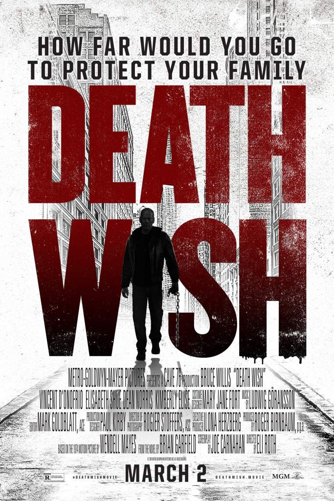 Death Wish was directed by Eli Roth, written by Joe Carnahan, who adapts from a novel by Brian Garfield and the original screenplay by Wendell Mayes, and stars Bruce Willis, Vincent D’Onofrio, Dean Norris, Kimberly Elise, Beau Knapp, Ronnie Gene Blevins, Jack Kesy, Camila Morrone and Elisabeth Shue. It follows a doctor as he turns vigilante to find the men who destroyed his life and family.