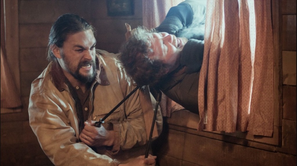Joe Braven (Momoa, sporting a sick last name) is the blue-collar hero dealing with plenty of issues, most pressing of which is his father Linden’s (Lang) brain injury, causing him to get into scuffles around town. Joe takes his wife Stephanie (Wagner), Linden, and, unintentionally, the couple’s daughter Charlotte (Rossof) to the family cabin to discuss options. While all this is going on, truck driver and employee of Joe, Weston (Fletcher) is asked by Hallett (McClarnon), a runner for drug trafficker Kassen (Dillahunt), to work for Kassen. Once Weston tries transporting product, drugs are spilled and must be stored at the currently empty cabin.