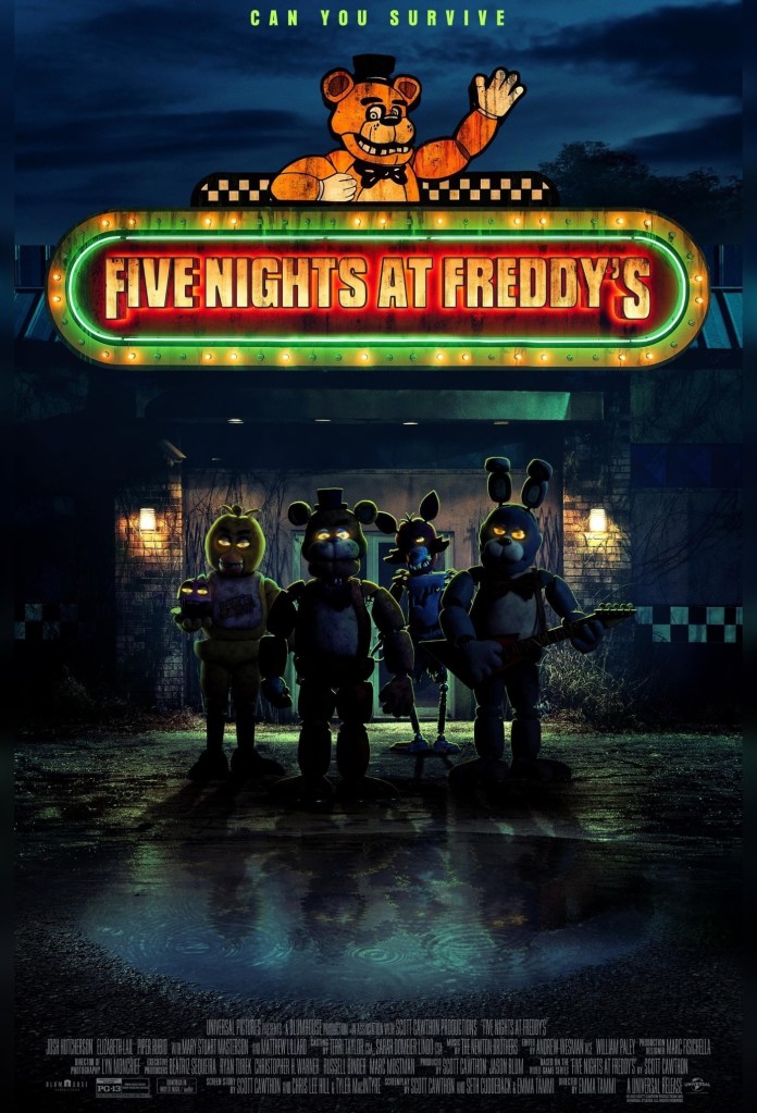 Five Nights at Freddy’s was directed by Emma Tammi, written by Tammi, Scott Cawthon, and Seth Cuddeback, who base their script on Cawthon’s games of the same name; it stars Josh Hutcherson, Piper Rubio, Elizabeth Lail, Mary Stuart Masterson, and Matthew Lillard. It’s about a newly hired night supervisor surviving his new job while learning about the parent company’s troubled past.